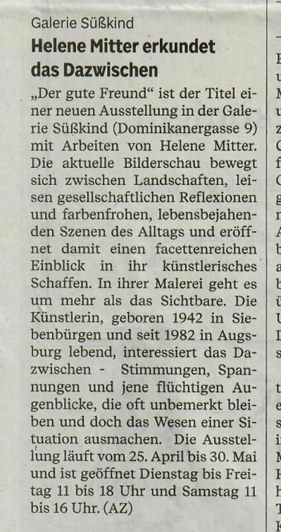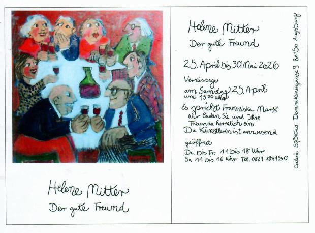 "Farblich in einer frohen Vitalität und für mich mit einem ausgesprochen lebendigen Strich präsentiert uns Helen Mitter Menschen, die meisten auf einem Sofa. Das ist auch das einzig erkennbare Requisit auf diesen Bildern. Menschen füllen die Bildfläche, meistens Paare, die feinfühlig und feinsinnig in verschiedenen emotionalen Zuständen zu sehen sind. Beim Bild „Feierabend“ sitzt ein älteres Ehepaar da, die ältere Frau hat noch die Schürze an, aber die Füße stecken schon in Hausschlappen. Im Bild „Kommunikation“ sprechen die Augen Bände. Die kleinformatige Serie „Tango, Milonga“ fasziniert, einerseits in der gekonnt unbekümmert-expressiven Darstellung der Tanzpaare und gleichzeitig in der genauen Aufmerksamkeit für die melancholisch-leidenschaftliche Atmosphäre."